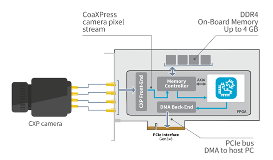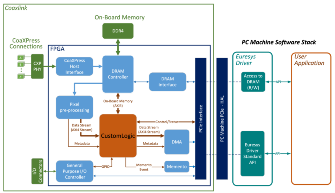 在Coaxlink FPGA內部,所有數據流接口都基于AMDA AX14流協議。在源端,用戶邏輯接收從CXP相機獲取到的圖像,在目標端,數據流接口將由用戶邏輯生成的結果圖像或數據傳輸到PCI Express DMA后端通道,DMA傳輸系統可以直接將數據在外設和內存之間進行高速傳輸,節省CPU的占用,從而使圖像處理獲得更多計算資源。此外,多達4G的DDR4板載內存也可以用于存儲中間數據和系數。