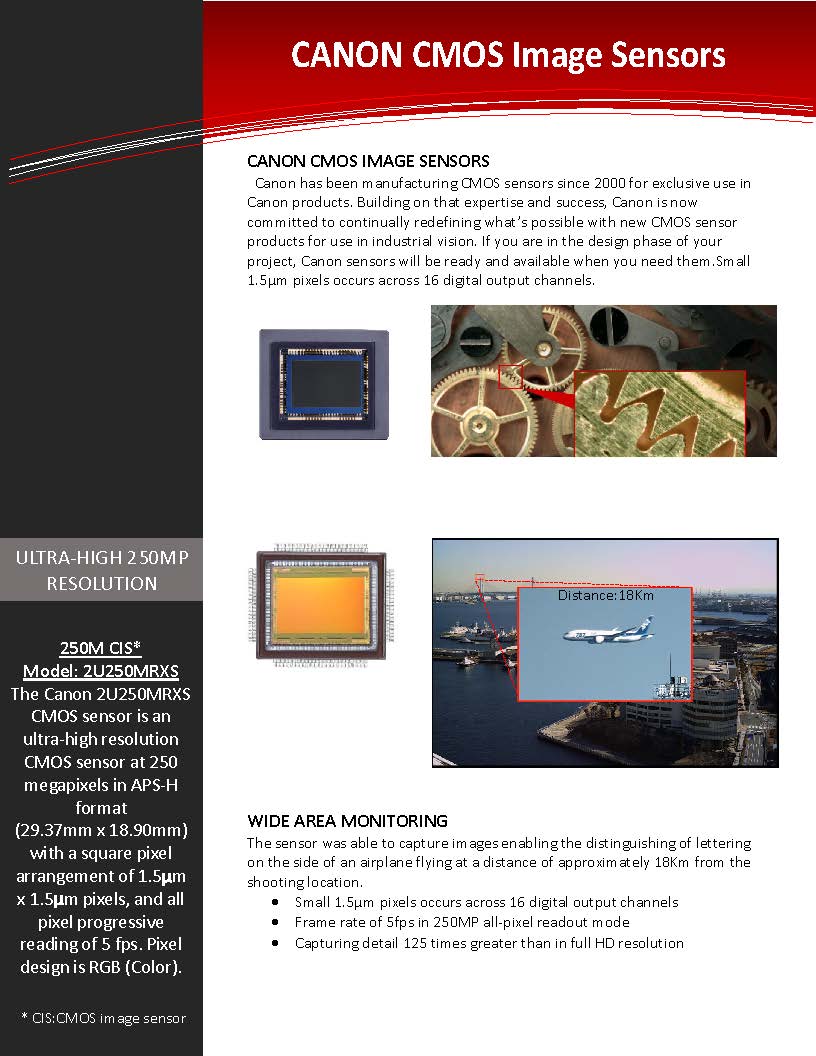 Model: 2U250MRXS The Canon 2U250MRXS CMOS sensor is an ultra-high resolution CMOS sensor at 250 megapixels in APS-H format (29.37mm x 18.90mm) with a square pixel arrangement of 1.5μm x 1.5μm pixels, and all pixel progressive reading of 5 fps. Pixel design is RGB (Color).