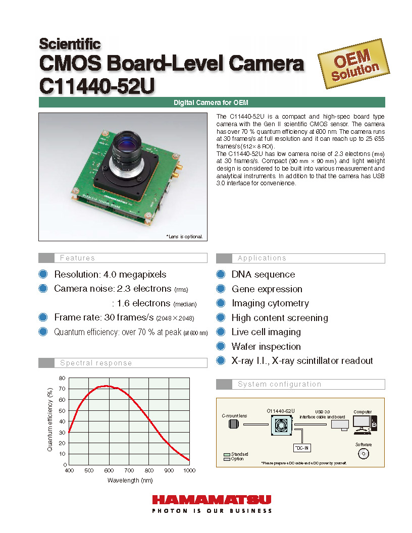 The C11440-52U has low camera noise of 2.3 electrons (rms) at 30 frames/s. Compact (90 mm × 90 mm) and light weight design is considered to be built into various measurement and analytical instruments. In addition to that the camera has USB 3.0 interface for convenience.