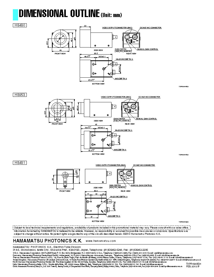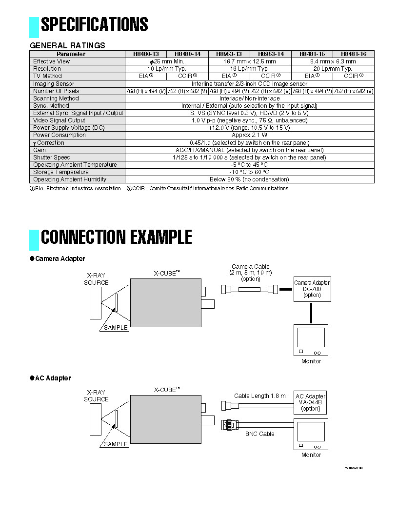 The H8480 has a large effective view of 25 mm diameter and a resolution of 10 Lp/mm, while the H8953 has an effective view of 16.7 mm × 12.5 mm and a resolution of 16 Lp/mm, while the H8481 offers an effective view of 8.4 mm × 6.3 mm and a high res-olution of 20 Lp/mm.