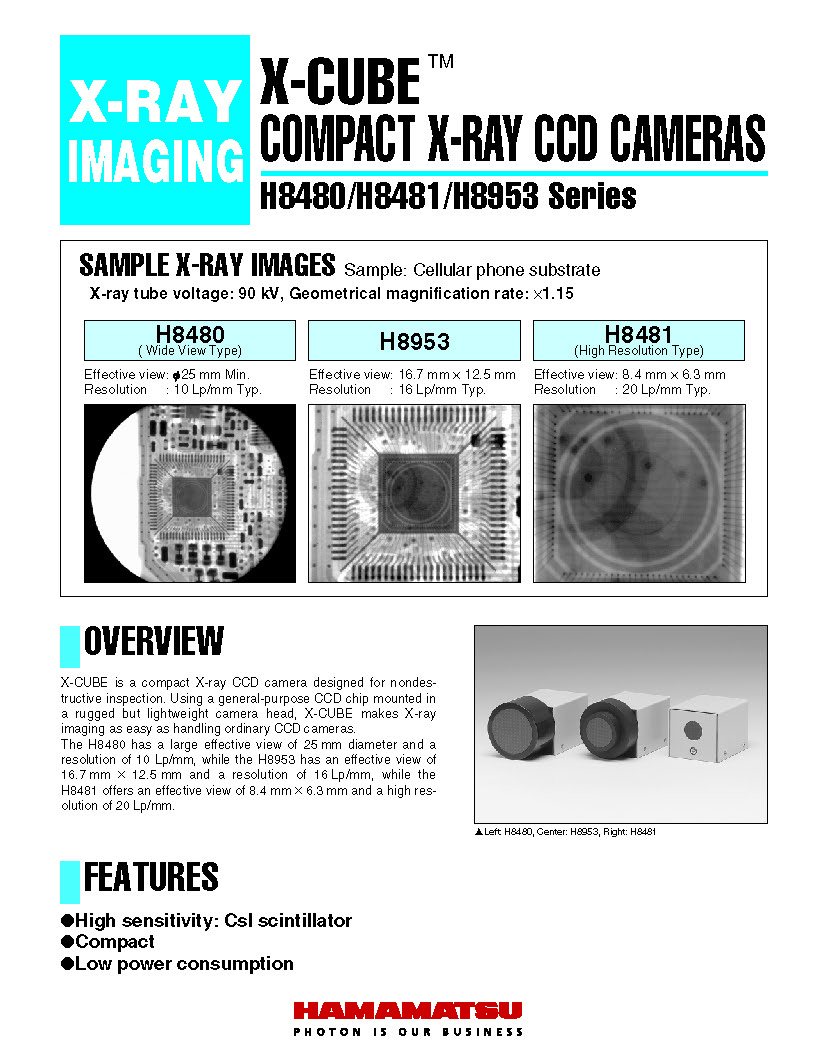 X-CUBE is a compact X-ray CCD camera designed for nondes-tructive inspection. Using a general-purpose CCD chip mounted in a rugged but lightweight camera head, X-CUBE makes X-ray imaging as easy as handling ordinary CCD cameras.